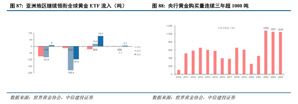 边际需求对黄金定价的解释力度增强。回归传统的供需逻辑后,由于黄金供给相对稳定,年产量基本维持在3600吨左右,因此黄金的真正定价变量在需求尤其是边际需求,黄金的需求主要包括3部分:私人部门消费需求、私人部门投资需求,以及官方购金需求,过去黄金的边际需求主要由欧美ETF需求(欧美地区私人部门投资需求,主要为海外机构投资者)贡献,而其需求或投资框架主要取决于美国国债实际利率;2023年以来黄金需求结构发生了深刻变化,全球央行购金以及亚洲地区(尤其中国)私人部门投资需求的弹性明显增强,海外机构投资者对于黄金的定价权重显著削弱。